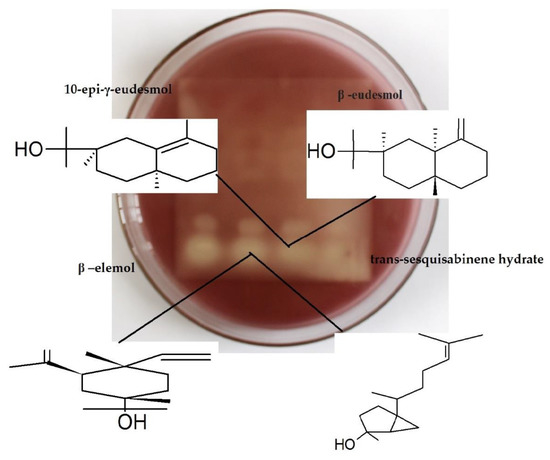 The four molecules involved correspond to the group of hydroxylated sesquiterpenes (molecules with 15 carbon atoms and OH group). In region Rf 0.02 are located: elemol (7.21%) and trans-sesquisabinene hydrate (8.23%). In region Rf 0.04 are found: β–eudesmol (3.49%) and 10-epi-γ-eudesmol (1.07%). HP-TLC plates show increased activity in Rf 0.04.