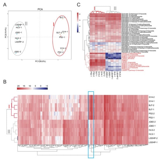 Metabolome analyses of the leaves of six mulberry cultivars. (A) PCA score plot of metabolite profiles in leaves of mulberry cultivars BJ7, G14, PS2, HLS, JQ82, and LSDHP. (B) Hierarchical clustering of differentially accumulated metabolites in leaves of BJ7, G14, PS2, HLS, JQ82, and LSDHP. Blue box represents flavones. Intensity values were adjusted by log2 transformation, and are represented as colors ranging from white to red. (C) Hierarchical clustering of flavonoid metabolites in leaves of BJ7, G14, PS2, HLS, JQ82, and LSDHP. Intensity values were adjusted by log2 transformation, and are represented as colors ranging from navy to red.