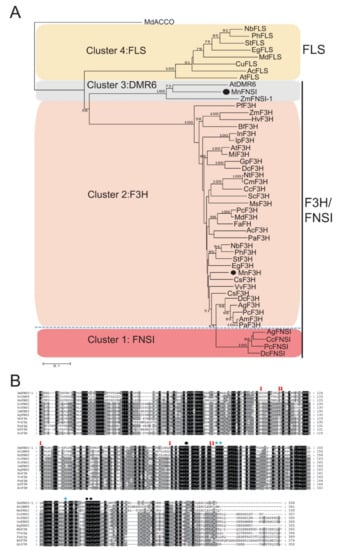 Sequence alignment and phylogenetic analysis of Fe2+/2-oxoglutarate-dependent dioxygenases involved in flavonoid biosynthesis. (A) Phylogenetic tree constructed with aligned protein sequences with MEGA 5 using the neighbor-joining method with 1000 bootstrap replications. Different Fe2+/2-oxoglutarate-dependent dioxygenases are grouped in clusters according to their main demonstrated activities. (B) Comparison of MnFNSI proteins with other FNSI and F3H proteins. Red arrow indicates sites determining catalytic activity of FNSI. Asterisks and black dots indicate conserved amino acids necessary for cofactor or substrate binding, respectively.