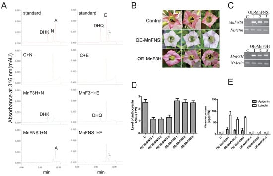 Functional characterization of MnFNSI. (A) UPLC chromatograms of products from MnFNSI and MnF3H with naringenin and eriodictyol as substrates. C: bovine serum albumin; A: apigenin; L: luteolin; N: naringenin; E: eriodictyol; DHK: dihydrokaempferol; DHQ: dihydroquercetin. (B) Phenotypes of transgenic tobacco harboring MnFNSI and MnF3H. (C) Detection of transgene expression by semi-quantitative RT-PCR analysis. NtActin was used as internal control gene. (D) Anthocyanin contents in control and transgenic tobacco flowers. (E) Flavone contents in flowers of control and transgenic tobacco plants.