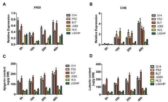 Next, qRT-PCR analyses showed that the transcript levels of FNSI in mulberry leaves were generally higher in the group I cultivars than in the group II cultivars, consistent with the accumulation patterns of flavones in the leaves of the six cultivars (Figure 4A). As flavones may play a role in protecting plants against UV-B radiation, we further examined whether mulberry FNSI expression and flavones accumulation in the leaves are regulated by UV-B radiation. After 4 h of UV-B radiation treatment, the flavones contents in the leaves of the cultivars continuously increased, whereas the transcript levels of FNSI in these cultivars first decreased and then increased (Figure 4A,C,D). Considering that the biosynthesis of flavones is also controlled by upstream key genes, we performed qRT-PCR analysis to detect CHS, the first key gene controlling the flavonoid pathway. As expected, the transcript levels of CHS in mulberry leaves increased dramatically upon exposure to UV-B (Figure 4B). These results suggest that the up-regulation of CHS results in greater carbon flux into the flavonoid pathway, and that although FNS is initially slightly down-regulated under UV-B stress, the ability to biosynthesize flavones is still increased.