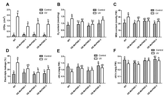 UV-B tolerance analyses of MnFNSI transgenic tobacco plants. Analysis of DNA damage, superoxide accumulation, lipid peroxidation, membrane injury, and chlorophyll content in wild-type and transgenic tobacco overexpressing MnFNI after the UV-B treatment. (A) CPDs levels. (B) O2− content. (C) MDA content. (D) Electrolyte leakage. (E,F) chlorophyll content (Chl a and Chl b). Data are means ± SE of three biological replicates from three different experiments. Different lowercase letters indicate significant differences among treatments (One-way ANOVA test, p < 0.05).