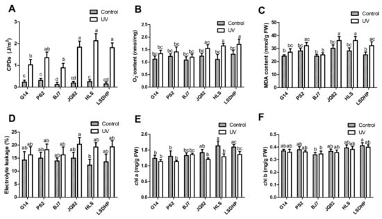 UV-B tolerance analyses of the six mulberry cultivars. Analysis of DNA damage, superoxide accumulation, lipid peroxidation, membrane injury, and chlorophyll content in leaves of mulberry cultivars BJ7, G14, PS2, HLS, JQ82, and LSDHP after the UV-B treatment. (A) CPDs levels. (B) O2− content. (C) MDA content. (D) Electrolyte leakage. (E,F) chlorophyll content (Chl a and Chl b). Data are means ± SE of three biological replicates from three different experiments. Different lowercase letters indicate significant differences among treatments (One-way ANOVA test, p < 0.05).