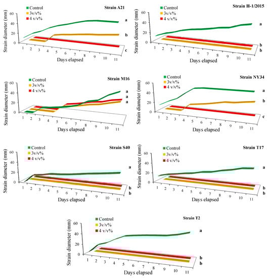 Growth (mm) of different late blight strains treated with 3 and 4 v/v% populin and distilled water (control) during the 10-day assessment period. Different letters mean statistically significant differences at the p ≤ 0.01 level (Mann-Whitney test).