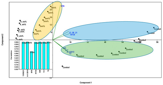 Principal Components Analyses (PCAs) showing the effects of 3 and 4 v/v% populin treatments or their absence (control) on the colony growth of different late blight strains under lab conditions. The average strain-dimension data in plates after 3 and 4 v/v% and the controls were considered and log10 transformed. Correlations between PCA values are given in bar charts. The blue and green colors represent the PCA axis direction of the control effect related to sensible stains. Yellow represents the PCA axis direction of the populin 3 and 4 v/v% concentrations effects.