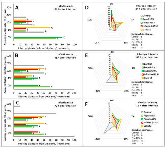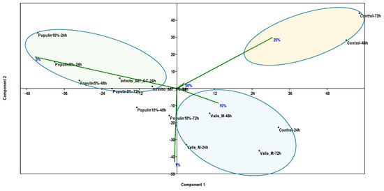 Higher infection intensity at the 1% level was observed after 24 h using Valis M (Figure 3D). The same tendency toward 10% infection remained after 48 and 72 h using Valis M with similar high infection intensity for the control as well (Figure 3E,F). PCA also revealed the effectiveness of populin 5% and 10% under field conditions. According to PCA, synthetic fungicide Valis M allowed an average of 10% infection after 24, 48 and 72 h, while the lack of any treatments resulted in 25% infection in all time points (Figure 4).