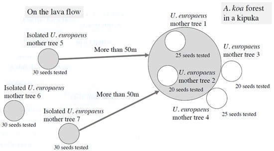 Details of the mother trees used for leaf sampling. Acasia koa has formed a forest in the kipuka (sandbank-like, old substrate made by the lava flow). Two mother trees each were in and adjacent to the A. koa forest. Three mother trees on the lava were isolated more than 50 m away from the A. koa forest. Lettuce seed numbers tested on the leaf samples are indicated below each mother tree.