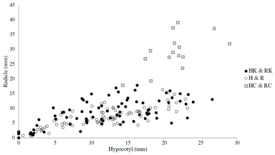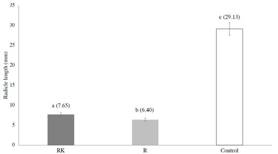 Radicle lengths of lettuce seeds. RK: Radicle of the lettuce seeds tested on the leaves sampled in and adjacent to the A. koa forest. R: Radicle of the lettuce seeds tested on the leaves sampled more than 50 m away from the A. koa forest. C: Control. The bars represent standard error, and the different letters above bars indicate significant differences (p < 0.05). The numbers in the parenthesis are the mean values of the hypocotyls (mm).