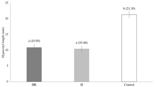 Hypocotyl lengths of lettuce seeds. HK: Hypocotyl lengths of the lettuce seeds tested on the leaves sampled in and adjacent to the A. koa forest. H: Hypocotyl lengths of the lettuce seeds tested on the leaves sampled more than 50 m away from the A. koa forest. C: Control. The bars represent standard error, and the different letters above bars indicate significant differences (p < 0.05). The numbers in the parenthesis are the mean values of the hypocotyls (mm).