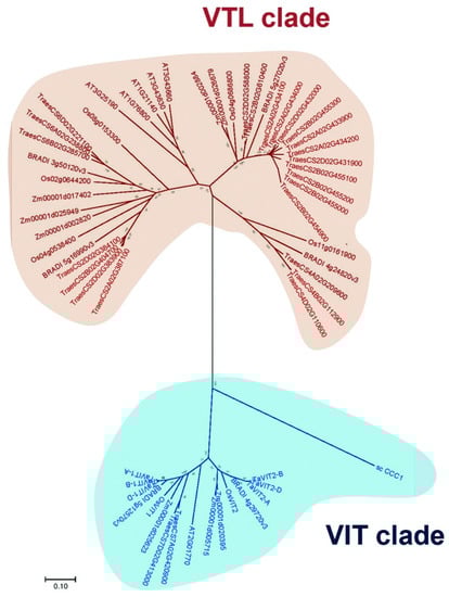 Phylogenetic analysis showing separation of vacuolar iron transporter (VIT) family in Arabidopsis, Brachypodium, Oryza sativa, Zea mays and Triticum aestivum into two distinct clades; vacuolar iron transporter-like (VTL) clade and VIT clade. The neighbour-joining phylogenetic tree was generated using MEGA. The numbers represent bootstrap values from 1000 replicates.