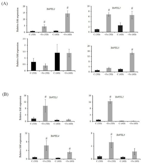 Tissue-specific qRT-PCR expression analysis of wheat VTL genes during Fe deficiency (-Fe) and in the control (C) conditions. Wheat seedlings were subjected to Fe deficiency for three and six days represented as -Fe(3D) and -Fe(6D). The controls for the respective time points are represented as C(3D) and C(6D). (A) Fold expression analysis was performed in roots and (B) in shoots. 2 µg of total RNA for the cDNA preparation. Relative fold expression levels were calculated relative to C(3D). Ct values were normalized using wheat ARF1 as an internal control. Vertical bars represent the standard deviation. # represents the significant difference at p < 0.05 with respect to their respective control treatments.