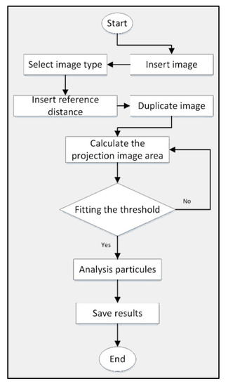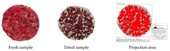 The projected area of the thin layer rose petals was measured using the pixel method in the ImageJ program. ImageJ is Java-based, readily available, open-source, independent platform, and public domain software developed at the National Institutes of Health (NIH), Bethesda, Maryland USA [30]. This method was held at two-dimensional axes (x and y) with reference to the pixel colors. Before and after the drying process, this technique could be used due to being available and being free of charge to be accepted for the indexed journal. The software could measure many parameters of the image analysis, including the projected and surface area of leafy plants like roses. The program uses a threshold-based pixel count measurement to calculate the petals area. Figure 2 illustrates the flowchart of the usage of ImageJ to measure the projected area [31,32]. Nevertheless, the images were taken with the Huawei P20 16 MP camera before and after the drying process in the experiment.