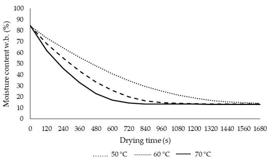 The drying process (initial moisture content, 85.45% w.b.) was incessant until the final moisture content was ca. 13% (w.b.). Figure 3 shows the changes in moisture content as a function of drying temperature with IR. It was calculated that the drying period reached the above-mentioned safe moisture level at 600, 1080, and 1680 s at 70, 60, and 50 °C, respectively. Drying time reduced dramatically with the increase in infrared temperature. As the temperature increased from 50 °C to 70 °C, the drying time was reduced by about 280%. Balladin and Headley and also Ertekin and Heybeli [24,26] reported that the drying time for rose petals was 16 h for solar drying, and drying time was between 1080 s and 2280 s at drying temperatures of 80–60 °C for mint, respectively. When the effects of temperature on moisture were examined in detail, our results were in line with those for banana slices using infrared and hot air dryer [37], drying tomato under convective infrared drying [38], pulsed vacuum drying, infrared-assisted hot air-drying and hot air-drying for red pepper [39], and nettle leaves under microwave and infrared drying [40,41].