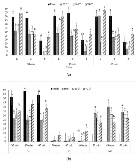 L, a, b (a) and C, h, ∆E (b) changes at different air temperatures and time. a,b; Different letters of upper index within the column indicate significant differences at p < 0.05 level.