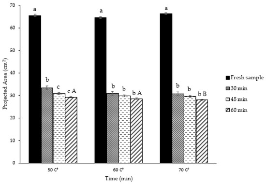 When compared to fresh samples, the projection area reduced by approximately half at all treatments. These experiments confirmed that the drying time decreased when compared with convective, freeze, heat pump, solar, and natural sun drying.