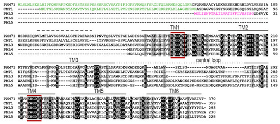 Alignments were generated using Clustal Omega [47]. Putative secretory pathway signal peptides (SP) were predicted with TargetP [48] and transmembrane helix predictions were obtained from the Aramemnon database [49,50] with manual adjustments. Arabidopsis sequence data were obtained from the National Center for Biotechnology Information [51] under the following accession numbers: NP_564825.1 (PAM71, At1g64150); NP_193095.2 (CMT1, At4g13590); NP_568535.1 (PML3, At5g36290); NP_173923.1 (PML4, At1g25520); NP_177032.1 (PML5, At1g68650).