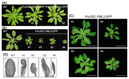 Photographs of stably transformed Arabidopsis lines. (A) Pro35S::PML4:GFP and Pro35S::PML5:GFP plants in comparison to a wild-type plant are shown. (B) WT and transgenic lines Pro35S::PML3:GFP #1, #2, #3, #4 were grown for 3 weeks under a 12 h/12 h light–dark cycle and 2 weeks in the greenhouse. (C) Magnified images of plants shown in (B), Scale bar = 1 cm. (D) Magnified images of individual leaves taken from the plants shown in (B) and (C), Scale bar = 2 mm.