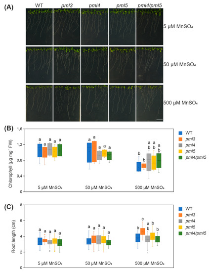 Analysis of wild-type, pml3, pml4, pml5 and pml4/pml5 grown under different Mn regimes (A) Photographs were taken from representative samples. Plants were grown in the indicated Mn condition, in a vertical position under a 16 h/8 h light–dark cycle at 100 µmol photons m−2 s−1 for 10 days. Scale bar = 1 cm (B) Five to six plants per genotype and condition were combined for one chlorophyll extraction and at least five extractions were prepared. Data are depicted as boxplots representing the range of values, the exclusive median and the mean, indicated as x (n ≥ 5). FW = fresh weight. (C) The length of the primary root of all plants are depicted as boxplots representing the range of values, the exclusive median and mean, indicated as x (n ≥ 35 per genotype and condition). Outliers are indicated as dots. (B,C): different letters indicate statistical significance according to ANOVA (p < 0.05, Tukey’s honestly significant difference (HSD) test). Mean values and standard deviations are given in Tables S2 and S3. Poorly germinated seeds were excluded from the analysis.