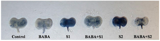 Effect of BABA on the superoxide (O2•–) accumulation of rapeseed (Brassica napus L.) seedlings exposed to different concentrations of salt stress. Here, BABA, S1 and S2 indicate 150 μM β-aminobutyric acid, 100 mM NaCl, and 150 mM NaCl, respectively.