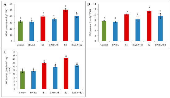 Effect of BABA on MDA content (A), H2O2 content (B), and LOX activity (C) of rapeseed (Brassica napus L.) seedlings exposed to different concentration of salt stress. Means (± SD) were calculated from three replications (n = 3) for each treatment. Average from three replications (n = 3) was used to determine mean (± SD) for each treatment. Letters with different values varied significantly at p ≤ 0.05 according to Fisher’s LSD test. Here, BABA, S1 and S2 indicate 150 μM β-aminobutyric acid, 100 mM NaCl and 150 mM NaCl, respectively.