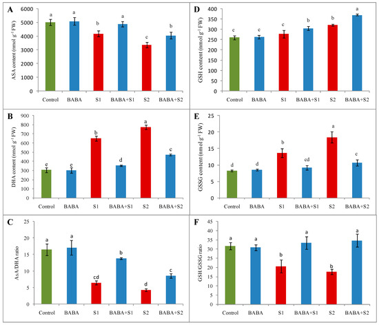 Effect of BABA on ascorbate (AsA) (A) and dehydroascorbate (DHA) (B) contents, AsA/DHA ratio (C), glutathione (GSH) (D) and oxidized GSH (GSSG) (E) contents, and GSH/GSSG ratio (F) of rapeseed (Brassica napus L.) seedlings exposed to different concentrations of salt stress. Average from three replications (n = 3) was used to determine mean (± SD) for each treatment. Letters with different values varied significantly at p ≤ 0.05 according to Fisher’s LSD test. Here, BABA, S1 and S2 indicate 150 μM β-aminobutyric acid, 100 mM NaCl and 150 mM NaCl, respectively.