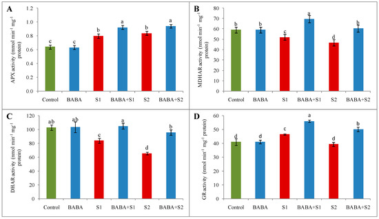 Effect of BABA on activity of APX (A), MDHAR (B), DHAR (C), and GR (D) of rapeseed (Brassica napus L.) seedlings exposed to different concentrations of salt stress. Means (± SD) were calculated from three replications (n = 3) for each treatment. Average of three replications (n = 3) was used to determine mean (± SD) for each treatment. Letters with different values varied significantly at p ≤ 0.05 according to Fisher’s LSD test. Here, BABA, S1 and S2 indicate 150 μM β-aminobutyric acid, 100 mM NaCl and 150 mM NaCl, respectively.