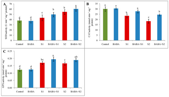 Effect of BABA on activity of superoxide dismutase (SOD) (A), catalase (CAT) (B), and glutathione peroxidase (GPX) (C) of rapeseed (Brassica napus L.) seedlings exposed to different concentrations of salt stress. Average from three replications (n = 3) was used to determine mean (± SD) for each treatment. Letters with different values varied significantly at p ≤ 0.05 according to Fisher’s LSD test. Here, BABA, S1 and S2 indicate 150 μM β-aminobutyric acid, 100 mM NaCl and 150 mM NaCl, respectively.