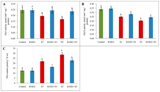 Glyoxalase (Gly) I and Gly II activity decreased under salt stress. The activity of Gly I decreased by 20% and 32% and the activity of Gly II decreased by 27% and 40% under 100 and 150 mM NaCl stress, respectively. However, pretreatment with BABA followed by 100 and 150 MM NaCl concentration increased the activity of Gly I by 25% and 40% and the activity of Gly II by 13% and 19%, respectively, in comparison with their respective stresses (Figure 6A,B). Likely due to the action of BABA, the activity of both Gly I and Gly II was involved in scavenging toxic methylglyoxal (MG). Methylglyoxal increased by 74% and 129% under 100 and 150 mM NaCl stress, respectively. However, the enhanced efficiency of Gly I and Gly II due to BABA pretreatment was involved in the reduction in MG content by 24% and 20% under 100 and 150 mM NaCl stress, respectively (Figure 6c).
