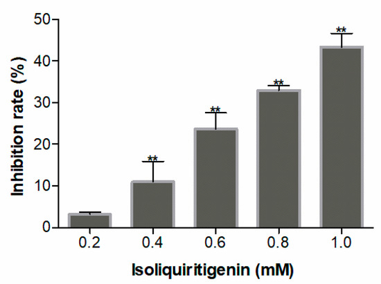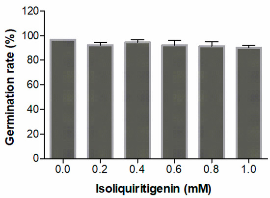 Isoliquiritigenin was assayed for its effects on seed germination and seedling growth of lettuce, which is known to be a ‘standard target species’ in allelopathy research. The experimental results for seedling growth showed that isoliquiritigenin had a concentration-dependent inhibitory effect on the radicle elongation of lettuce seedlings. When the concentrations of isoliquiritigenin were higher than 0.8 mM, the radicle lengths decreased by more than 40%, as shown in Figure 1. In contrast, no differences in seed germination following any of the treatments indicated that isoliquiritigenin had no significant impact (p > 0.05) on lettuce germination (Figure 2).