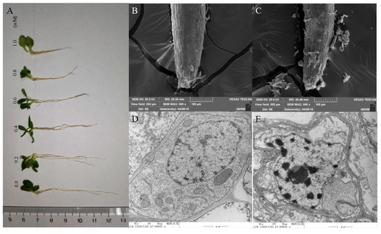 Pictures of the effect on growth length of lettuce radicles treated with isoliquiritigenin: (A) scanning electron microscope images of lettuce radicle surface under control (B) and treatment (C) with isoliquiritigenin (1 mM), and representative transmission electron microscope images of the ultrastructure of lettuce radicle cells under control (D) and treatment (E) with isoliquiritigenin (1 mM).