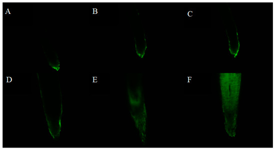 Representative pictures of ROS accumulation in lettuce radicle tips on treatment with different concentrations of isoliquiritigenin (A: control, B: 0.2 mM, C: 0.4 mM, D: 0.6 mM, E: 0.8 mM, F: 1.0 mM).