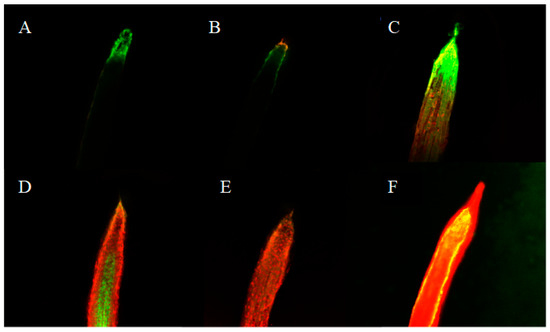 Representative pictures of cell viability in lettuce radicle tips after treatment with different concentrations of isoliquiritigenin. (A: control, B: 0.2 mM, C: 0.4 mM, D: 0.6 mM, E: 0.8 mM, F: 1.0 mM).