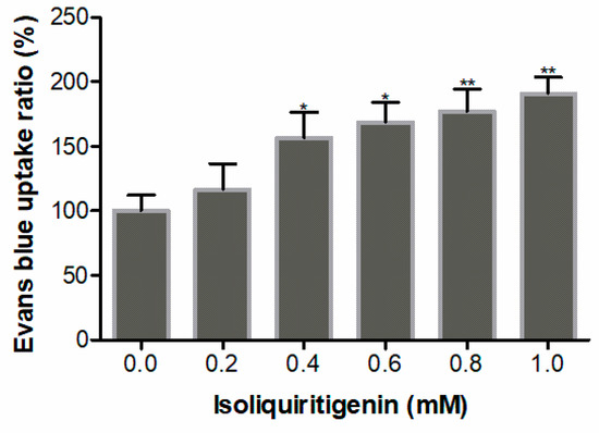 Relative Evans blue uptake in lettuce radicles after treatment with different concentrations of isoliquiritigenin. Values are expressed as a percentage of the mean compared to the control. Error bars are one standard deviation of the mean. N = 3. One asterisk * and two asterisks ** represent the significant difference between the isoliquiritigenin-treated lettuce radicles and the control at p < 0.05 and p < 0.01, respectively.