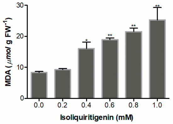 MDA content in lettuce radicles after treatment with different concentrations of isoliquiritigenin. Data presented are the mean ± standard deviation of results from three independent experiments. N = 3. One asterisk * and two asterisks ** represent the significant difference between isoliquiritigenin-treated lettuce radicles and the control at p < 0.05 and p < 0.01, respectively.