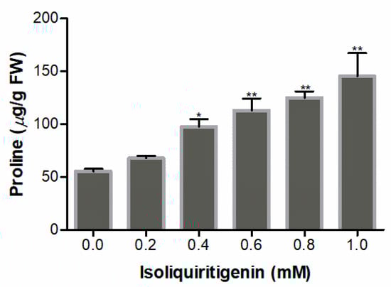 Proline content in lettuce seedlings after treatment with different concentrations of isoliquiritigenin. Data presented are the mean ± standard deviation of results from three independent experiments. N = 3. One asterisk * and two asterisks ** represent the significant difference between the isoliquiritigenin-treated lettuce seedlings and the control at p < 0.05 and p < 0.01, respectively.