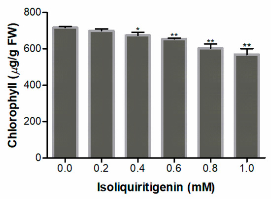 Chlorophyll content is a representative index of plant photosynthetic ability. The reduction of chlorophyll production after treatment with isoliquiritigenin depended on the concentrations used (Figure 10). At 1.0 mM, the content of chlorophyll was 567 μg/g FW, a decrease by 21%, compared to the control.