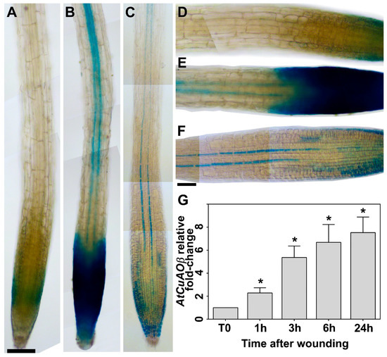 Considering that AtCuAOβ expression is induced by the wound-signal hormone MeJA, especially in the root vascular tissues [11], here, AtCuAOβ gene expression profile upon cotyledonary leaf wounding was investigated by AtCuAOβ-promoter::GFP-GUS transgenic analysis and reverse transcription-quantitative polymerase chain reaction (RT-qPCR) (Figure 1). Tissue specific expression analysis of AtCuAOβ-promoter::GFP-GUS plants wounded on cotyledonary leaf showed a strong induction in the vascular tissues at the transition, elongation and maturation root zone, as well as in root cap (Figure 1b,e), as compared to control unwounded plants (Figure 1a,d). The tissue-specific pattern revealed after wounding was similar to that observed in unwounded seedlings after prolonged staining (24 h) (Figure 1c,f), showing a similar pattern to that previously revealed in 4-day-old plants [11]. Consistently, RT-qPCR analysis shows a strong progressive induction of AtCuAOβ gene expression levels from 1 to 24 h, with a 2-, 5-, 6.5- and 7.5-fold increase, respectively, compared to T0 levels (Figure 1g).