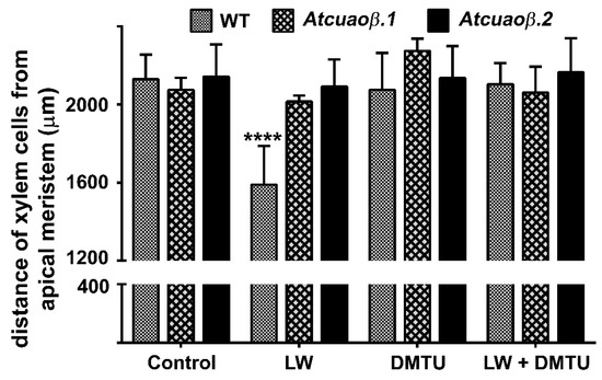 Analysis of differences in protoxylem maturation in 10-day-old leaf-wounded (LW) WT and mutant (Atcuaoβ.1 and Atcuaoβ.2) seedlings, grown in medium with or without the H2O2-scavenger DMTU at a final concentration of 100 μM. Distances from the apical meristem of the protoxylem position (defined by the position of the first protoxylem cell with fully developed secondary cell wall thickenings) are reported. These experiments were repeated at least three times with 10 seedlings analyzed each time (mean values ± SD; n = 30). The statistical significance levels (p-values) were evaluated with one-way analysis of variance (ANOVA) followed by Sidak’s multiple comparison test (****, p ≤ 0.0001). Insignificant differences are not indicated.