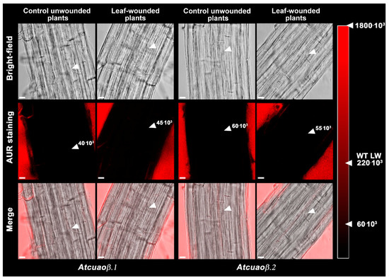 Furthermore, to verify the involvement of H2O2 produced via AtCuAOβ-driven PA oxidation in the wound-induced-signaling pathways leading to early root protoxylem differentiation, H2O2-dependent Amplex Ultra Red (AUR) fluorescence assay was performed in 7-day-old roots of Atcuaoβ mutants wounded or not on the cotyledonary leaf (Figure 3). Neither in roots of unwounded nor in those of leaf-wounded Atcuaoβ mutants, H2O2-dependent AUR fluorescence was detectable at the site of differentiating protoxylem elements (Figure 3; Supplementary Materials Figure S1), as compared to roots of WT wounded plants where clear AUR staining was detectable [10].