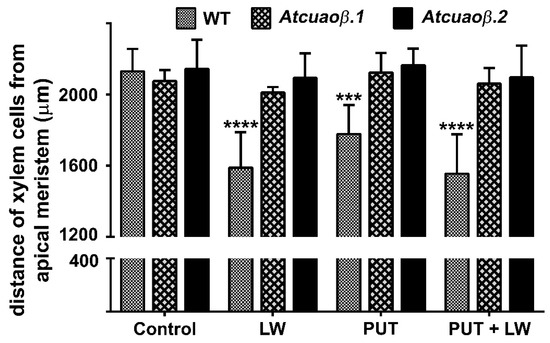 Analysis of differences in protoxylem maturation in 10-day-old leaf-wounded (LW) WT and mutant (Atcuaoβ.1 and Atcuaoβ.2) seedlings, grown in medium with or without 100 µM Put. Distances from the apical meristem of the protoxylem position (defined by the position of the first protoxylem cell with fully developed secondary cell wall thickenings) are reported. These experiments were repeated at least three times with ten seedlings analyzed each time (mean values ± SD; n = 30). The statistical significance levels (p-values) were evaluated with one-way analysis of variance (ANOVA) followed by Sidak’s multiple comparison test (****, p ≤ 0.0001; ***, p ≤ 0.001). Insignificant differences are not indicated.