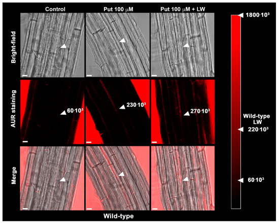 Figure 5 shows that 6 h after treatment with 100 µM Put, a strong AUR signal was revealed in the root zone where the first protoxylem cell with fully developed secondary cell wall thickenings is found in WT, which was not detectable in roots of unwounded Put-untreated control WT and unwounded and wounded Put-treated Atcuaoβ mutant seedlings (Figure 5 and Supplementary Materials Figure S2). Moreover, the combination of cotyledonary leaf wounding and Put treatment in WT seedlings did not seem to increase H2O2 accumulation at the site of differentiating protoxylem elements compared to wounding or Put treatment alone, suggesting that the plateau effect reached in terms of protoxylem position is correlated to the H2O2 production induced by leaf wounding (Figure 5, Supplementary Materials Figures S1 and S2).