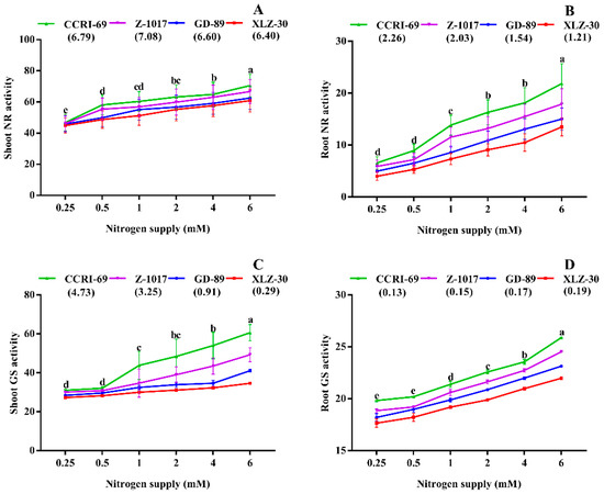 Nitrogen uptake efficiency was significantly improved by 63%–67% under high nitrogen 6 mM as compared to 0.5 mM and 0.25 mM nitrogen. However, the increase was more obvious for CCRI-69 compared with other genotypes, especially GD-89 and XLZ-30, which showed a reduction of 22% and 24%, respectively (Figure 1C). Conversely, nitrogen utilization efficiency decreased with an increase in nitrogen supply; however, low nitrogen levels improved nitrogen utilization efficiency by 20%–33% (Figure 1D). The increase in nitrogen utilization efficiency was 10% higher in CCRI-69 as compared to XLZ-30 (Figure 1D). To better understand these genotypic differences, the activities of enzymes involved in N metabolism were also determined.