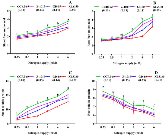 (A) Shoot free amino acid (mg g−1), (B) root free amino acid (mg g−1), (C) shoot-soluble protein (mg g−1), and (D) root-soluble protein (mg g−1) of contrasting nitrogen-efficient cotton genotypes under various nitrogen concentrations (0.25, 0.5, 1, 2, 4, or 6 mM NO3−). The values are presented as mean ± standard error (n = 9).