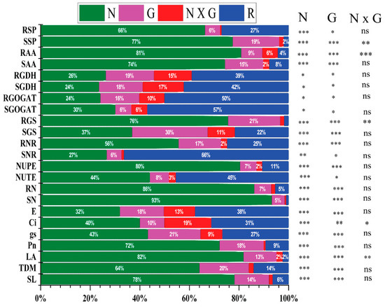ANOVA of morphological, physiological, and biochemical traits of contrasting nitrogen-efficient cotton genotypes in response to various nitrogen concentrations (0.25, 0.5, 1, 2, 4, and 6 mM). The main effects (nitrogen (N) and genotypes (G), interaction (N × G)) and residual (R) are represented as percentage of type III sums of squares. p-values of the F-test are indicated. * p < 0.05; ** p < 0.01; *** p < 0.001; ns: not significant. RSP, root-soluble protein; SSP, shoot-soluble protein; RAA, root-free amino acid; SAA, shoot-free amino acid; RGDH, root GDH activity; SGDH, shoot GDH activity; RGOGAT, root GOGAT activity; SGOGAT, shoot GOGAT activity; RGS, root GS activity; SGS, shoot GS activity; RNR, root NR activity; SNR, shoot NR activity; NUpE, N uptake efficiency; NUtE, N utilization efficiency; RN, root N concentration; SN, shoot N concentration; E, transpiration rate; Ci, intercellular CO2 concentration; gs, stomatal conductance; Pn, net photosynthesis; LA, leaf area, TDM, total plant dry matter; SL, shoot length.