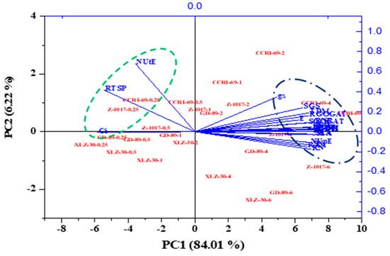Principal component analysis (PCA) of morphophysiological and biochemical traits of contrasting N-efficient cotton genotypes in response to various nitrogen concentrations (0.25, 0.5, 1, 2, 4, and 6 mM NO3−). The PCA shows the biplot of the first two principal components. The eigenvectors are shown in Table S1.