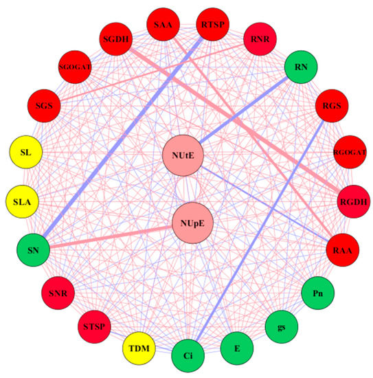 Relationships between morphological (yellow), physiological (green), and biochemical (red) traits with NUpE and NUtE (brown). Nodes represent the traits and edges (red, positive; blue, negative) represent the correlations. The thickness of the edges represents the strength of correlation coefficient for each pair. TDM, total plant dry matter; SL, shoot length; SLA, single leaf area; Pn, net photosynthesis; gs, stomatal conductance; E, transpiration rate; Ci, intercellular CO2 concentration; SN, shoot nitrogen concentration; RN, root nitrogen concentration; SNR, shoot nitrate reductase activity; RNR, root nitrate reductase activity; SGS, shoot glutamine synthetase activity; RGS, root glutamine synthetase activity; SGOGAT, shoot glutamate synthase activity; RGOGAT, root glutamate synthase activity; SGDH, shoot glutamate dehydrogenase activity; RGDH, root glutamate dehydrogenase activity; SAA, shoot-free amino acid; RAA, root-free amino acid; STSP, shoot total soluble protein; RTSP, root total soluble protein.