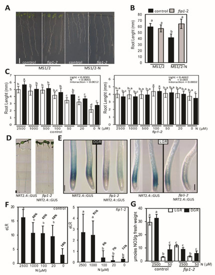 Root illumination and polyadenylation affect root growth and LR formation under nitrogen starvation. (A) Representative pictures of control and fip1-2 mutant grown for 10 days in MS1/2 with or without nitrogen. Scale bar: 1cm. (B) Root growth quantification of seedlings grown as in A. (C) Root growth of 10-days-old control or fip1-2 seedlings grown with different concentrations of nitrogen. White and black bars correspond to light- or dark-grown root seedlings respectively. (D) Representative picture of GUS staining NRT2.4::GUS seedlings grown in MS1/2 medium for 5 days and then transferred to MS1/2 containing 50 µM of N for 2 extra days. Scale bar: 1 cm. (E) Higher magnification of the root tip from seedlings shown as in A. Scale bar: 500 µm. (F) Number of emerged lateral roots (eLR) of control or fip1-2 seedlings grown in MS medium containing different concentrations of nitrogen during 10 days. Numbers above the bar correspond to the percentage of eLR with respect to the maximum nitrogen medium (2500 µM). (G) Amount of NO3− in control or fip1-2 grown during 10 days in medium containing high N (2500 µM) or low N (50 µM). (B,F) Significance was analyzed by ANOVA and Tukey HSD post-hoc test. p < 0.05. (C,G) Significance was analyzed by two-way ANOVA and Bonferroni post-hoc test. Error bars correspond to S.E.
