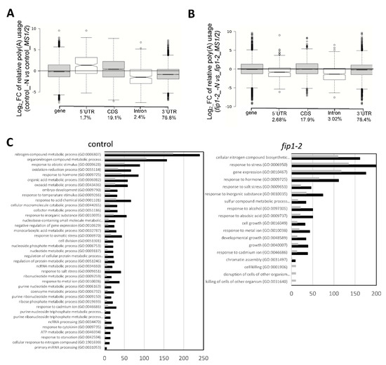 Next, we analyzed the overlapping between genes whose expression is altered in Arabidopsis roots by N starvation [24] and those that showed differentially poly(A) usage in response to N starvation (this work). Genes whose expression was statistically significant higher than 2-fold or more and lower than −2-fold were identified and overlapped with the sets of genes affected by APA upon N deprivation. We found that between 3 and 4% of the genes in each class were common (Figure 3A,B and Table S2A), both in control and fip1-2 plants, respectively. This result indicates that, for the most part, APA affects a set of genes that are somewhat distinct from those whose overall expression changes in response to N starvation, in both genotypes.