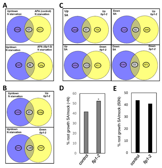 Transcript overlapping between alternative polyadenylation and N starvation responses and salicylic acid response. (A) Venny´s diagrams of common genes between of those up- and down-regulated (Up/down) by nitrogen starvation and transcripts showing APA in control or fip1-2 (B) Venny’s diagrams of common genes between genes up- and down-regulated by nitrogen starvation and genes up-regulated (Up) or down-regulated (Down) in fip1-2. (C) Venny’s diagrams of common genes between genes up-regulated (Up) or down-regulated (Down) by salicylic acid treatment and genes up-regulated (Up) or down-regulated (Down) in fip1-2. The full list of overlapping genes can be found in Table S2. (D,E) Percentage of main root growth of seedlings grown for 5 days in MS1/2 medium with high N (+N) (D) or low N (50N) (E) and then 5 days to a similar medium containing 0 or 50 µM of SA. *, p < 0.05 by t-Test compared to control.