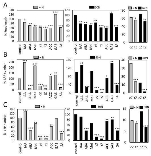 Effect of phytohormones on root growth and LR formation during N starvation. Dark-root growth Arabidopsis seedlings were grown with high (grey boxes) or low (black boxes) nitrogen for 5 days and then transferred to fresh medium containing similar N content and different hormones for 5 more days. Root length (A), lateral root primordia (LRP) (B) and eLRs (C) were quantified. Graphs represent the percentage of hormone-treated seedlings in respect to non-treated. *, p < 0.05; **, p < 0.01; ***, p < 0.001 by t-test compared to the respective control (mock) and nitrogen level. Right graphs show a magnification of the cZ and tZ effects. In this case, the significance was analyzed by t-test comparing the effect between cZ and tZ.